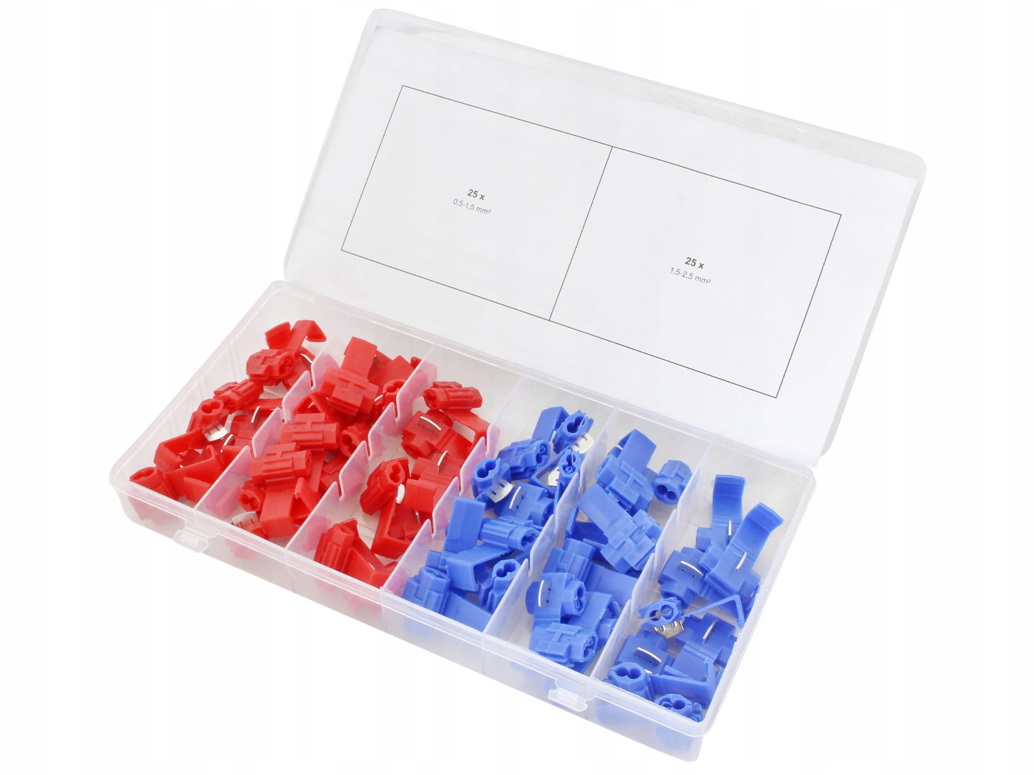 Złączki elektryczne - zestaw szybkozłączek, w dwóch kolorach i rozmiarach, pasujących do najbardziej popularnych średnic przewodów elektrycznych. Zestaw zawiera 50 elementów, a całość umieszczono w wygodnym sortowniku.