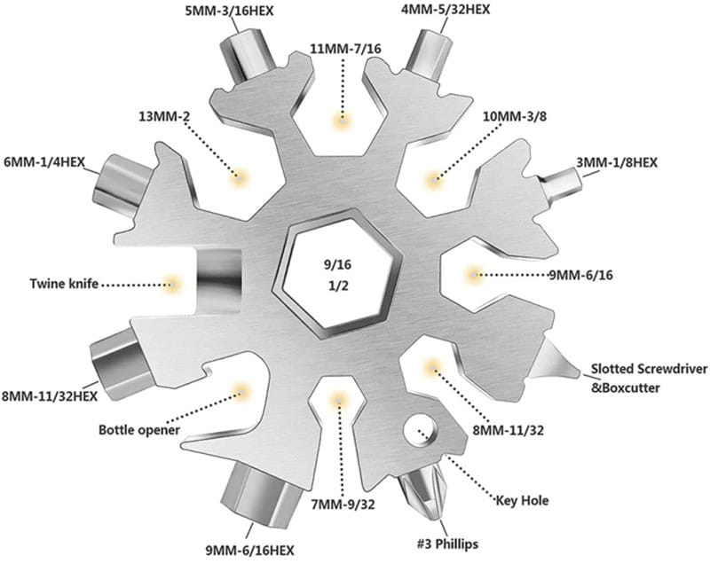 - KLlucz posiada kompaktowy rozmiar i wagę oraz unikalną konstrukcję w kształcie płatka śniegu, przez co można wygodnie nosić go przy sobie.