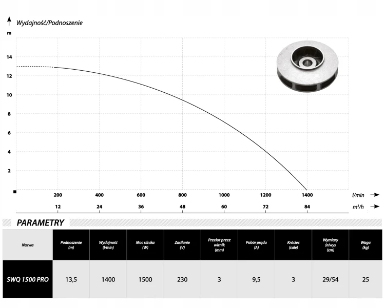 Pompa SWQ 1500 PRO to profesjonalna pompa zatapialna, przeznaczona do pracy zawodowej. Wykonana jest z wysokiej jakości tworzyw takich jak stal nierdzewna, dzięki czemu jest trwała i odporna na uszkodzenia. W pompie został użyty wirnik zamknięty, ze względu na to pompa może tłoczyć czystą, a także lekko zanieczyszczoną wodę. Pompa posiada naprawdę ogromną wydajność, może pompować aż 1400 litrów na minutę! W połączeniu z naprawdę niewielkimi rozmiarami i wagą daje nam to pompę niemal idealną do awaryjnych sytuacji.
