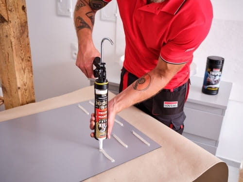 - Klej nakładać pasmami lub punktowo (maks. co 15 cm) na jedną z klejonych powierzchni, koniecznie w narożnikach i wzdłuż krawędzi klejonych przedmiotów.