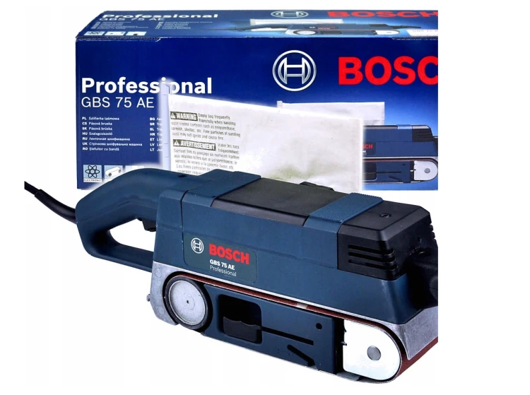 Szlifierka taśmowa Bosch GBS 75 AE to wytrzymała szlifierka sieciowa firmy Bosch zapewniająca maksymalną wydajność zbierania materiału. Aluminiowe rolki prowadzące narzędzia są przystosowane do wymagających zadań. Narzędzie posiada wytrzymały pasek zębaty oraz metalowe koła zębate gwarantujące długą żywotność. Narzędzia można także używać do prac stacjonarnych w pozycji odwróconej do góry nogami. Szlifierka jest przeznaczona do usuwania lakieru, szlifowania, wygładzania i czyszczenia powierzchni, a także do renowacji podłóg. Można ją stosować na powierzchniach drewnianych, metalowych i wykonanych z tworzyw sztucznych. Przy zastosowaniu adaptera do odsysania pyłu urządzenie jest kompatybilne z systemem Bosch Click & Clean.